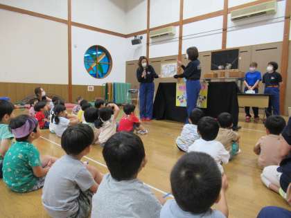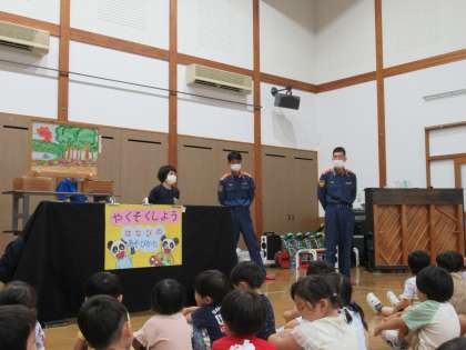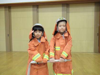 防火・防災教室がありました 公開日 2022/07/04 更新日 2022/07/04 1日の生活 7月4日(月) 今日は大沢野消防署の方にお越しいただき、花火についてのお話やマジック・クイズを見せていただきました。花火の扱い方に注意しながら楽しく遊ぶことを消防署の方と約束をしました。また、年長児は防火衣を着て、記念撮影をしました。ルールを守りながら楽しい夏を過ごしたいと思います。