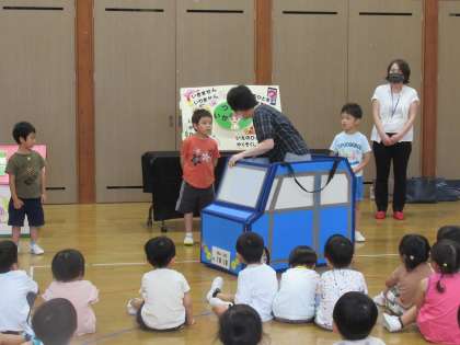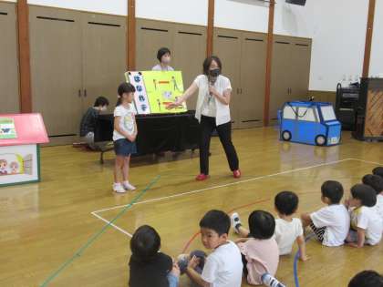 防犯教室がありました。 公開日 2022/07/14 更新日 2022/07/14 1日の生活 7月12日(火) 今日は防犯教室がありました。1人にならないことや、大声を出して助けを求めることなどを教わりました。つばめ組さんが代表で、知らない人から声をかけられた時の断り方や、知らない人との距離の取り方を実際にみんなの前でやってみました。話を上手に聞いていたので、しっかり断ることができていましたよ。その他に、捕まった時にどうやったら逃げられるかを教わり、最後に紙芝居を見せてもらいました。