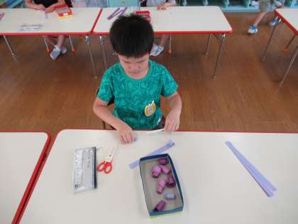 今日はブドウの製作をしたり、担任と一緒に「デカパンレース」をしたりしました。初めてのデカパンレースでしたが担任と息を合わせ走ることができました。色々な競技を楽しみたいと思います。