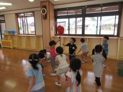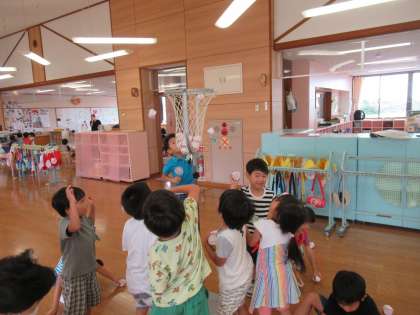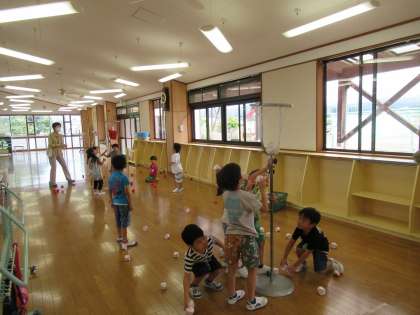 今日は午後からオープンスペースで玉入れをして遊びました。「先生、見ていてね」「入ったよ!」と嬉しそうな声も聞かれましたが「入らんかったー」「あれ?」と悔しがったり、考えたりしながら玉入れを楽しんでいました。「〇〇ちゃん、どうやって投げるの?」と友達の声をかけている子もいましたよ。なかなか入らなかった子も「少し遠いところから投げたら入るようになった!」と発見したことをキラキラした目で知らせてくれました。みんな全て投げ終わると「もう1回!」と玉入れに夢中なみんな。何度も繰り返し汗だくになって遊びました。