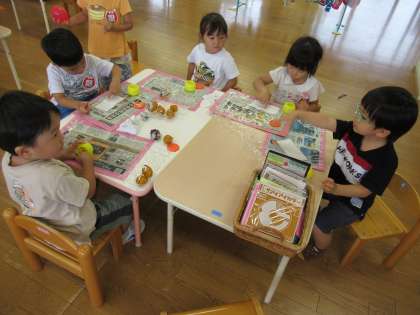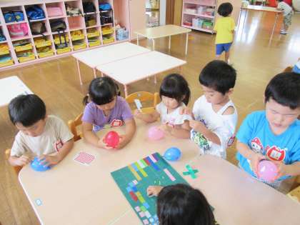 登園日に読んだ月刊誌でお祭りのお話があったことや、始業式に夏休みの思い出をみんなで話していたことで、子供たちから「お祭りがしたい」という意見が聞かれ、少しずつみんなでどんなお店を作りたいか話し合ってきました。少しずつ子供たちと一緒にお店の品物をつくり始め「僕もしたい」「私も」と参加する人数が増えてきました。1枚目は7日(水)のかき氷屋さんの様子です。今日はたこ焼き屋さん、ヨーヨー屋さんが始まり「たこ焼きは紙を丸めたらどう」「ヨーヨーは水が入ると音がするよ」と思いを出し合いながら作ることを楽しんでいました。
