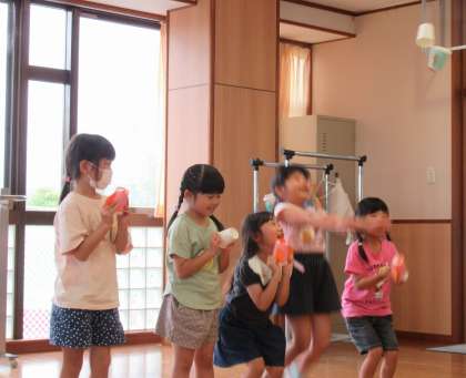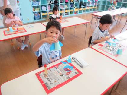 紙コップでロケットをつくりました 公開日 2022/09/15 更新日 2022/09/15 1日の生活 9月14日(水) 今日は実習生と一緒にロケットをつくって遊びました。出来上がったロケットを高く飛ばしたり、友達と競ったりして遊びました。