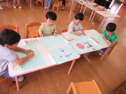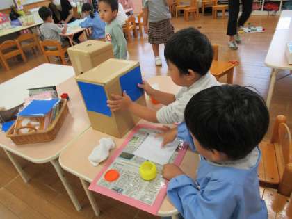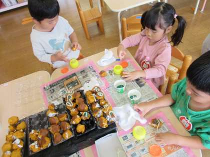 お祭りごっこでは、かき氷の機会に折り紙で色を付けたり、たこ焼きにソースやマヨネーズをつけたりして開店準備をしていましたよ。