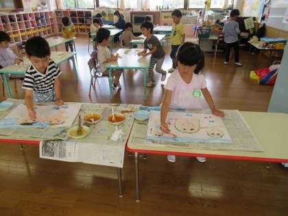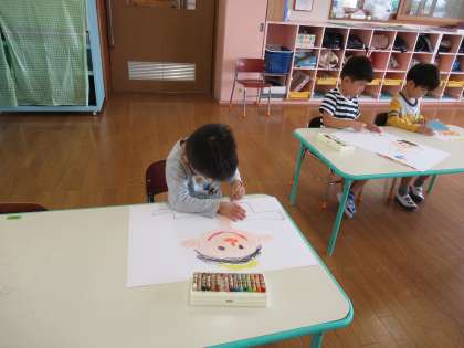 今日は運動会を振り返ってみんなで思い出の絵を描きました。スティックの踊りやバルーン、玉入れ、かけっこ等、思い出に残っている場面を思い思いに描きました。「これは○○ちゃん」「パパとママ見とるん」と友達や家族を描いている子もいましたよ。