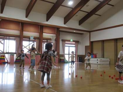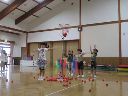 今日はみんなでダンシング玉入れをして遊びました。初めはダンスを踊り、途中で音楽が止まったら玉入れをして、また音楽が鳴り始めたら踊るという遊びです。音楽が止まると「キャー!」と楽しそうに玉を投げていましたよ。耳で音楽を聴き、投げる!踊る!頭も体も使い、汗だくになりながらもとても楽しそうな子供たちでした。