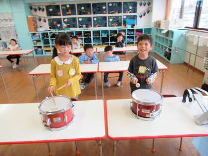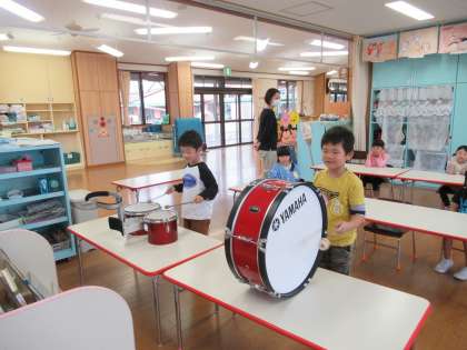 今日は発表会に向けいろいろな楽器に触れてみました。恐る恐る太鼓を鳴らしたり、「どん・どん・たいこ」とリズムに合わせて鳴らしたりする子供たちでした。