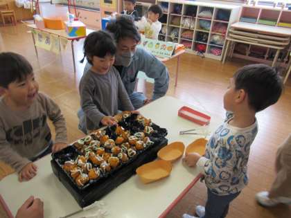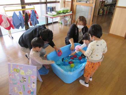 今日は午後から保育自由参観があり、7名の保護者の方がお祭りごっこに遊びに来てくれました。今日はヨーヨーつりや金魚すくい、たこ焼き屋さんが人気でしたよ。お家の方と色々なお店に行くことができてとても嬉しそうな子供たちでした。振り返りでは「全部楽しかった」という満足そうな声も聞かれました。