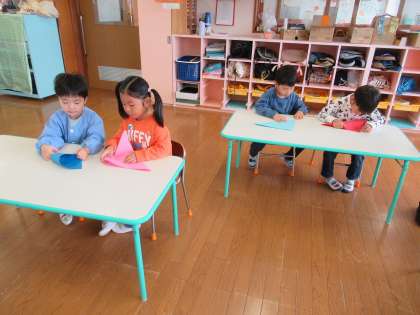今日はみんなが楽しみにしているハロウィンに向けてバッグをつくりました。大きな画用紙を折ることは初挑戦でドキドキしている様子も見られましたが「できたよ!」と嬉しそうな声が次々に聞こえて可愛いバッグができあがりました。