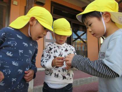 午後からはなかよし広場へ出て滑り台をしたり鉄棒に挑戦したり、トンボを捕まえたりして遊びました。「すごい!「葉っぱ食べとる!」と初めてトンボを近くでみて驚きと嬉しさの声を上げていた子供たちでした。