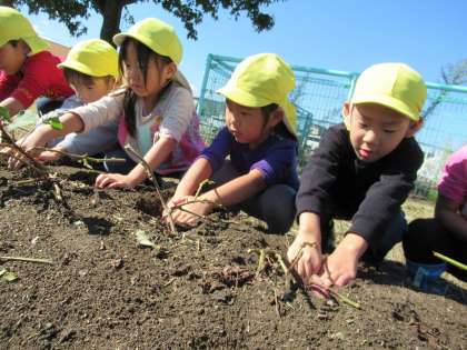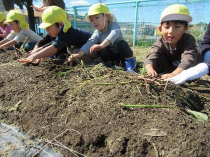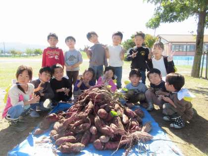 ピーターパン広場へ行く度にサツマイモの様子を見てサツマイモ掘りを楽しみにしていた子供たち。いよいよ収穫となり大喜びでした。サツマイモが顔を出すと「これ大きそうだよ」と目をキラキラと輝かせながら掘っていました。1つ収穫できると「先生!まだ掘りたい!」と次から次へと掘っていき、大量に収穫できました。掘ったサツマイモはお家に1つずつお土産として持ち帰りました。「美味しそうなのにしよう!」と楽しそうに選んでいる子供たちでした。