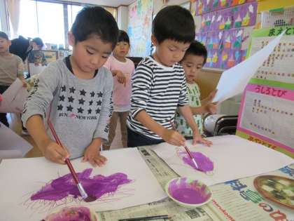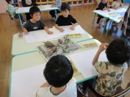 今日は昨日掘ったサツマイモを見てサツマイモの観察画を描きました。「葉っぱもあるね」「つぶつぶ付いてる」とサツマイモをよく見て描いていましたよ。