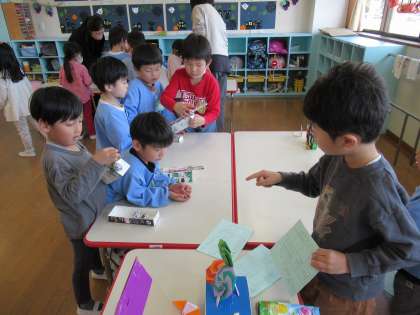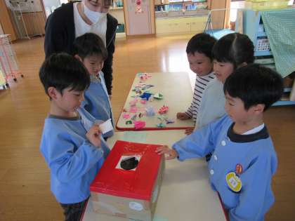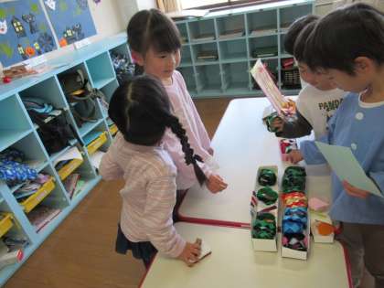 つばめ組ゲーム屋さんに、たんぽぽ組を招待しました 公開日 2022/10/26 更新日 2022/10/26 1日の生活 10月25日(火) 秋祭りを経験したつばめ組さん。つばめ組でも的あてや金魚すくい、くじ引き屋さんアクセサリー屋さんをやりたいという意見が聞かれ遊びが始まりました。できあがったゲーム屋さんにたんぽぽ組を招待しました。優しく遊び方を教えてあげたり、自分たちの遊び場を喜んでもらえたりして嬉しそうな、つばめ組でした。
