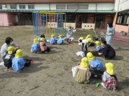チューリップの球根を植えました(たんぽぽ組) 公開日 2022/10/28 更新日 2022/10/28 1日の生活 10月27日(木) 今日はアール・タチバナさんにお越しいただき、一緒にチューリップの球根を植えました。SDGsについても教えていただき、みんなで108個の球根を植えました。来春、きれいなチューリップが咲くことを楽しみにしている子供たちです。