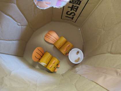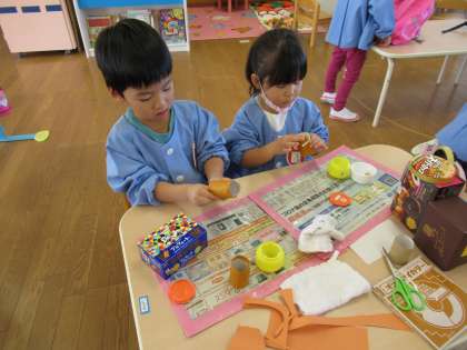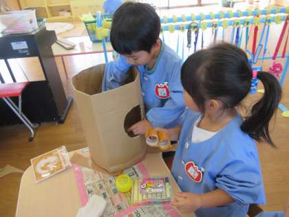 リスとリスの家ができました!(ほし組) 公開日 2022/11/02 更新日 2022/11/02 1日の生活 11月2日(水) 今日はどんぐりを手に持ち「どんぐり!リスさんが好きなやつ」と言っていた子がいたので、一緒にリスをつくりました。「木に住んでいるよ」と言う子もいたので段ボールで家をつくると、どんぐりを容器に入れて家の中に入れてあげてました。「かわいい」と上から眺めたり丸い穴からそっと覗いたりしていましたよ。
