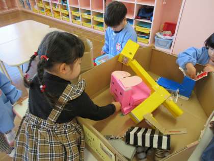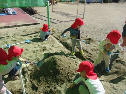 園庭では恐竜の化石掘りや大きなお山づくり、お店屋さんごっこやままごとなどを友達や先生と一緒に楽しみました。