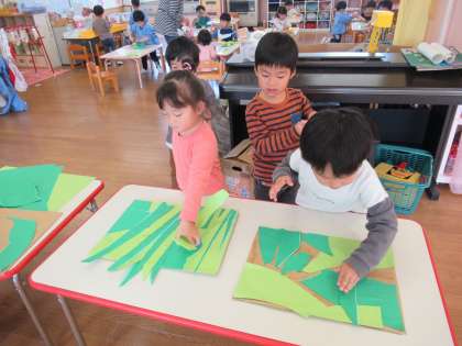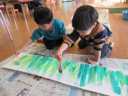 11月10日(木)、11日(金)のほし組の様子 公開日 2022/11/17 更新日 2022/11/17 1日の生活 10日、11日は劇で使用する大道具をみんなでつくりました。こぶたの家の煙突のレンガや草をのりで貼ったり、えのぐで草を描いたりしました。劇遊びも楽しんでいますが、劇に使うものをつくることも楽しいようで、少しずつ出来上がってきてとても嬉しそうな子供たちです。