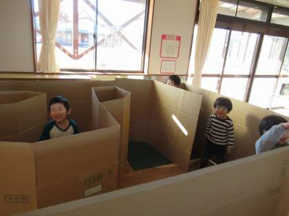 先日から「段ボール迷路をつくりたい」と言う子がいたので、昨日から少しずつ段ボールをつなぎ合わせてつくっていました。昨日はゴールがまだできていなかったので、迷路をグルグル回ることを楽しんでいましたが、今日はゴールができたことで、何度もゴールすることを喜んでいました。