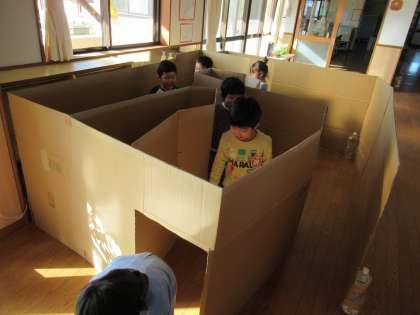 先日から「段ボール迷路をつくりたい」と言う子がいたので、昨日から少しずつ段ボールをつなぎ合わせてつくっていました。昨日はゴールがまだできていなかったので、迷路をグルグル回ることを楽しんでいましたが、今日はゴールができたことで、何度もゴールすることを喜んでいました。