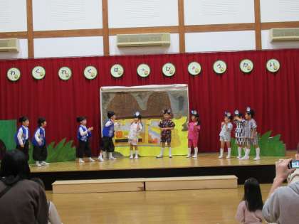 劇遊び「おむすびころりん」では、台詞を同じ役の友達と言ったり、一緒に踊ったりしました。お家の人に早くかっこいい姿を見てもらいたいと毎日練習をしてきたので、今日はお家の人の笑顔を見てとっても嬉しそうに自分の役を演じていました!子供たちのやる気いっぱい、笑顔いっぱいの発表になり、また1つパワーアップしたたんぽぽ組でした!