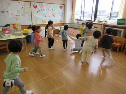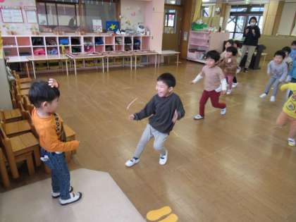 今日はみんなで「だるまさんが転んだ」をしました。すぐに鬼に近づき、タッチしようとする子や、捕まらないように後ろの方で少しずつ進む子、捕まりたくてわざと動いて見せる子など、様々な姿が見られましたが、どの子も「楽しかった!」と大喜びでした。