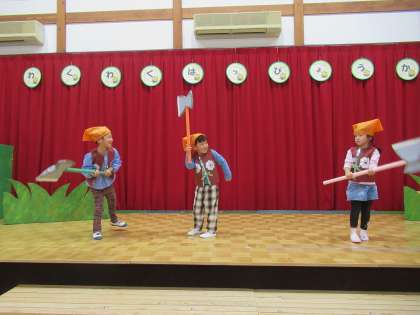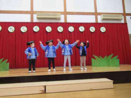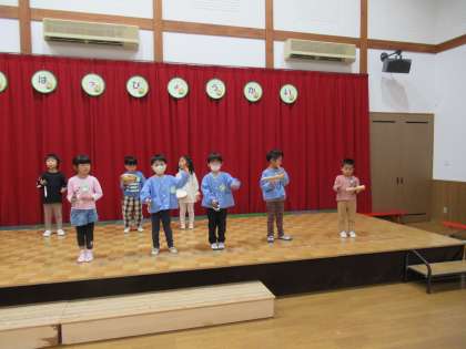 今日のたんぽぽ組の様子 公開日 2022/12/07 更新日 2022/12/07 1日の生活 12月2日(金) 発表会が終わると「また『おむすびころりん』したいね」「他の楽器もやってみたい」という子供たちの声が聞かれ、みんなで発表会ごっこをすることになりました。今日は発表会ごっこ2回目です。いろいろな楽器をやってみたい子、昨日とは違う役を楽しむ子、自分の楽器や役がお気に入りでもう一度楽しむ子など様々ですが、みんな友達のリズムや台詞を覚えていて楽しそうに合奏や劇遊びをしていました。