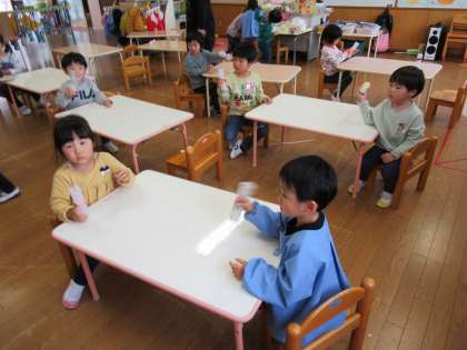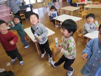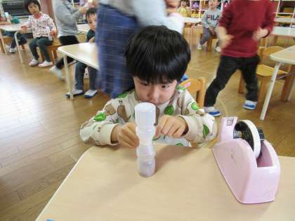 今日は手作り楽器をつくって遊びました。カップにどんぐりを好きな数だけ入れ、つなぎ目を自分でテープでとめました。好きな色のビニールテープで取れないようにとめたり、好きなシールを貼って可愛いミニ楽器ができました。出来上がり、音楽をかけると最初は座ったまま振って鳴らしていた子供たちですが、段々と楽しくなり、席を立って踊りながら鳴らしてみたり、先生や友達と一緒にリズムに乗って散歩しながら鳴らしたりととても楽しそうな子供たちでした。