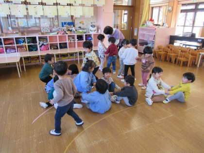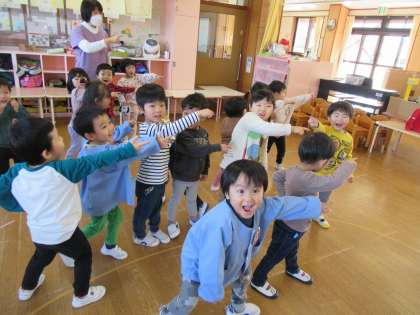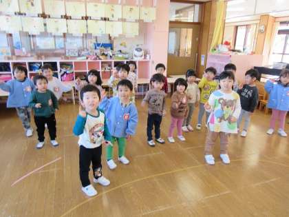 猛獣狩りゲームをしました!(ほし組) 公開日 2022/12/09 更新日 2022/12/09 1日の生活 12月9日(金) 今日は猛獣狩りゲームをしました。リズムに乗って言葉や動きを真似したり、友達を見つけて手をつないで座ったりし、繰り返し楽しむことで少しずつルールが分かるようになり、喜んで遊んでいた子供たちです。