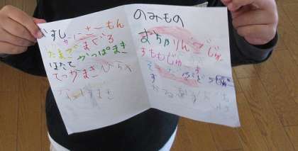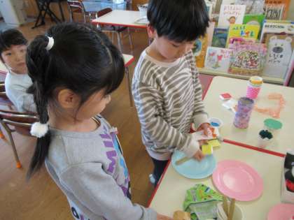 先週末からお寿司屋さんが始まりました。自分たちでメニュー表をつくったり、友達のつくったお寿司を食べたりすることを楽しんでいます。