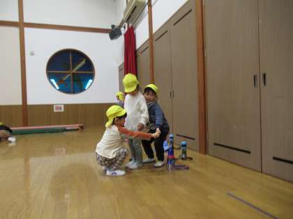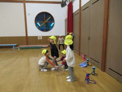 今日はプレイルームでみんなが大好きな鬼ごっこをしました。氷鬼やもも鬼をして遊んだ後、新しく電子レンジ鬼ごっこをして遊びました。鬼にタッチされて固まった友達を2人組で手を繋いでつくった電子レンジで温めてあげるとまた逃げられるようになるという遊びです。友達と協力して遊ぶゲームですが「○○くん一緒にチン!しよう」と声をかけて遊んでいました。「もう一回したい!」と楽しそうに遊んでいた子供たちでした。