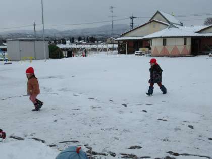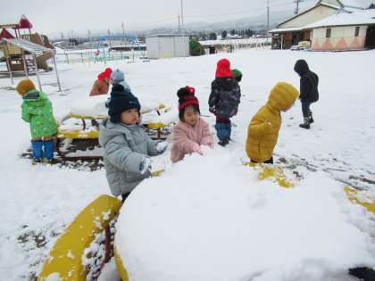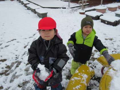 今日は登園するなり「雪遊びできるー!」と喜んでいた子供たち。「手袋や雪遊びの服はお家で練習してきたかな?」と聞くと「うん!」と張り切っていました。お家での練習のおかげで、思っていたよりも早く準備をすることができ、園庭で雪遊びを楽しみました。最初は雪をそっと触っていた子供たちでしたが、雪玉をつくって投げたり、雪だるまやおにぎりをつくったり、友達と追いかけっこをしたりと思い切り雪遊びを楽しむことができました。お家での練習や準備、ありがとうございました。