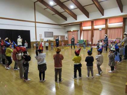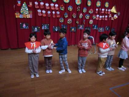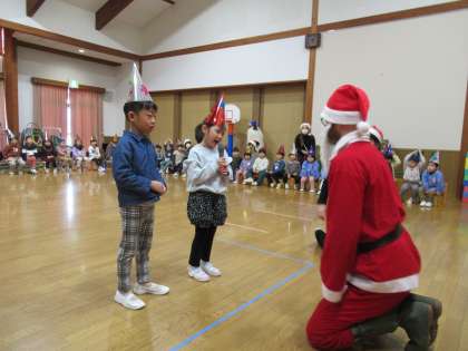 クリスマス会パート1 公開日 2022/12/22 更新日 2022/12/22 1日の生活 12月20日(火) 今日はクリスマス会がありました。サンタさんに疑問に思っていること「サンタさんはどうやっておうちに入るの」「サンタさんはいつも何をしてるの」等の質問したり、みんなで一つの輪になり「白いひげのサンタさん」の手遊びをしたりしました。年長組はキャンドルサービスもしました。 「来年も来てね」と約束してサンタさんとお別れしました。 来年もサンタさんが来てくれますように!
