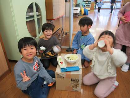 今日はたんぽぽ組さんのお店屋さんが気になり、遊びに行ってみました。たくさんの品物があり「これください」と次々に注文して、友達や先生と一緒に食べたり遊んだりして楽しみました。「おいしいね」「見て、こんなの買ったよ」と夢中になって遊んでいた子供たちでした。中にはたんぽぽ組さんがお金でやりとりしている姿を見て、クラスに戻って自分でお金や財布をつくって買いに行く姿も見られましたよ。