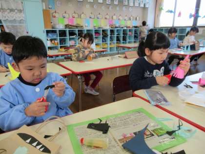 「僕は怒りんぼ鬼を追い出すよ」「私泣き虫鬼を追い出すよ」とどんな鬼を追い出すか友達と話しながら作っていました。2月3日の豆まき集会でお腹にいる鬼を追い出したいと思います。
