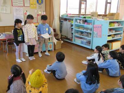 つばめ・たんぽぽ 公開日 2023/01/21 更新日 2023/01/21 1日の生活 1月20日(金) 当番の引継ぎをしました。お当番のやり方を説明した後一緒に当番活動をしました。たんぽぽ組さんに教えてあげる姿はとても優しくて頼もしいつばめ組さんでした。たんぽぽ組さんも年長組のお友達の話をしっかり聞いて当番活動をすることができました。来週からしばらく一緒に当番活動をしていきたいと思います。