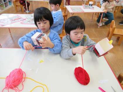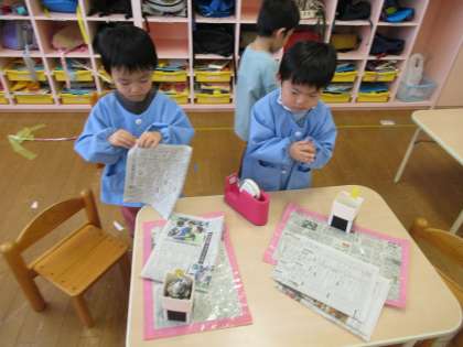 今日は鬼の豆を入れる升づくりや、豆に見立てた玉を新聞紙でつくったりしました。升は紙パックにマジックで顔を描いたり、毛糸を巻いたりしてつくりました。鬼を退治するために、たくさん豆(新聞紙ボール)をつくっていた子供たちです。