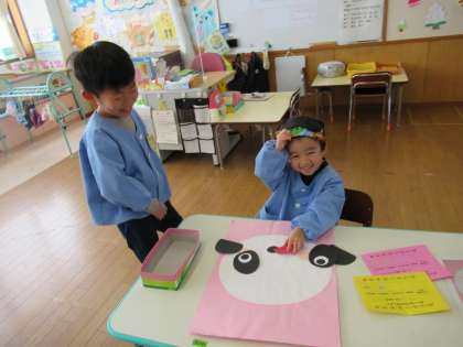 お正月お楽しみ会がありました。1 公開日 2023/01/25 更新日 2023/01/25 1日の生活 1月25日(水) 今日はお正月お楽しみ会がありました。異年齢でペアになり、コマ回し、羽根(風船)つき、かるた、福笑い、けん玉づくりの5つのコーナーを回り、お正月遊びを楽しみました。最後にみんなで「十二支の歌」を歌ったり「コマ回し」のリズム遊びをしたりして楽しみました。
