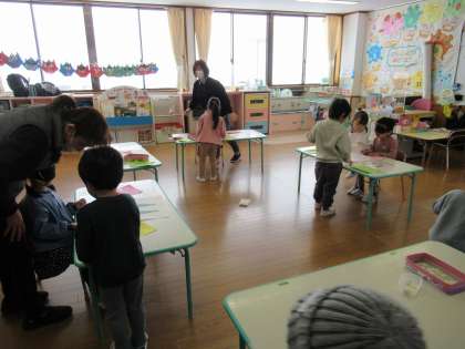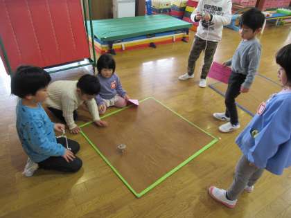 お正月お楽しみ会がありました。1 公開日 2023/01/25 更新日 2023/01/25 1日の生活 1月25日(水) 今日はお正月お楽しみ会がありました。異年齢でペアになり、コマ回し、羽根(風船)つき、かるた、福笑い、けん玉づくりの5つのコーナーを回り、お正月遊びを楽しみました。最後にみんなで「十二支の歌」を歌ったり「コマ回し」のリズム遊びをしたりして楽しみました。