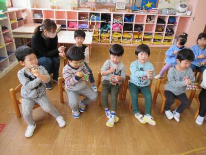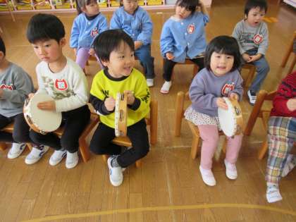 楽器遊びをしました。(ほし組) 公開日 2023/01/27 更新日 2023/01/27 1日の生活 1月27日(金) 今日はみんなで楽器遊びをしました。カスタネットやスズ、タンブリンをリズムや曲に合わせて鳴らしました。「できたよ」「きれいな音だね」と嬉しそうに鳴らしたり、優しく楽器を扱おうとしたりする姿が見られました。今日は発表会でやった「ハイ・ホー」の曲に合わせて鳴らすことも楽しみました。