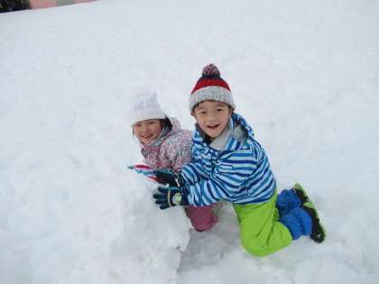 雪遊びをしました。友達と協力し合って大きな雪玉を作ったり、かまくらを作って遊びました。