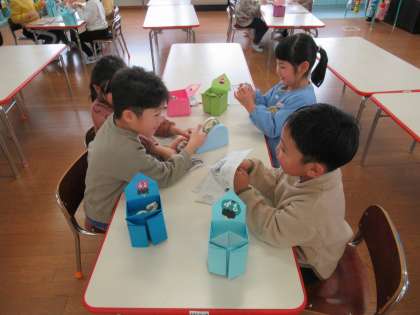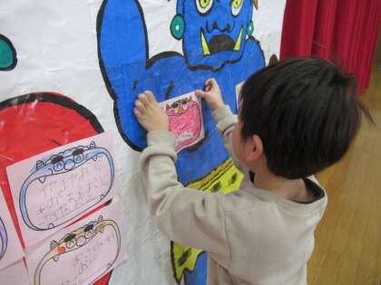 2月3日の豆まきで使う豆を、新聞で丸めて作ったり、退治したいお腹の中にいる鬼をプレイルームに飾ってある鬼に貼ったりしました。