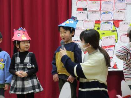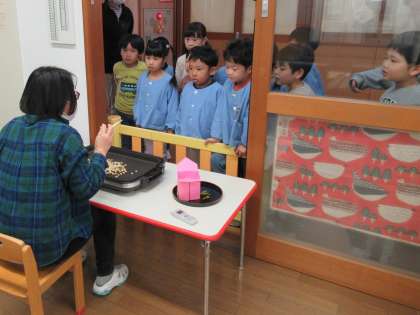 豆まき会がありました その1 公開日 2023/02/06 更新日 2023/02/06 1日の生活 2月3日(金) 今日は豆まき会がありました。朝から園長先生が「鬼が来ませんように」と豆を煎ってくださったのでみんなで見に行きました。豆まき会ではみんなで「豆まき」の歌を歌ったり、自分で作った鬼を紹介したりしました。