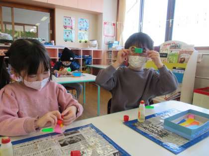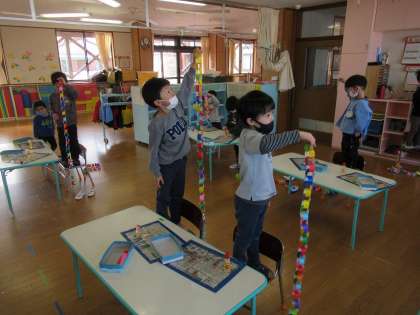 また、年長さんのお別れ会に向けてお別れ会会場を素敵に飾り付けようと輪つなぎをしました。自分の背より高いかな?先生の身長より長くなったかな?と時々比べながら楽しそうに準備を進める子供たちでした。