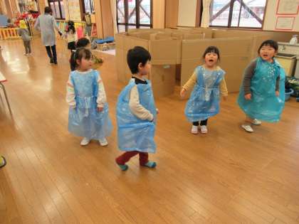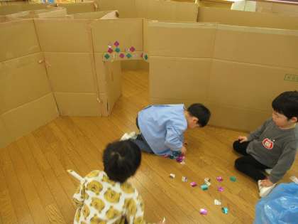エルサになりきってドレスをつくって遊ぶことを繰り返し楽しんでいる子供たち。エルサや王子様になって歌ったり踊ったりする中で「段ボールでお城をつくりたい」と言う声が聞かれ、段ボール迷路にキラキラの折り紙を貼り、お城に変身させています。「いいね!中にも貼ろう」ととっても嬉しそうな子供たちです。