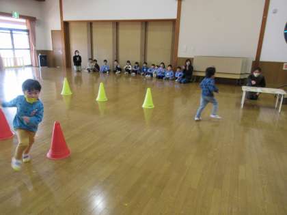 つばめ組は「変身お雛様ゲーム」をしました。12人一斉にスタートしてカードをめくり、書いてある衣装に着替えました。男の子がお雛様に変身したり、女の子が五人囃子に変身したりととてもかわいい変身を見ることができました。