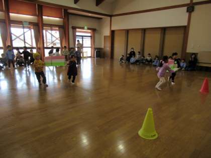 たんぽぽ組は「ひし餅運びゲーム」をし、2チームに分かれ、2人ペアになり、ひし餅を落とさないようにリレー形式で運んで競い合いました。ほし組もたんぽぽ組も白熱し、応援にも力が入っていましたよ。