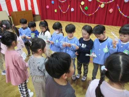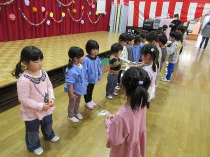 そしてつばめ組からもプレゼントのお返しをもらいました。一人一人絵が違う可愛いキーホルダーをもらいました。「わあー!」と大喜びの子供たち、互いに見せ合いっこする様子も見られました。