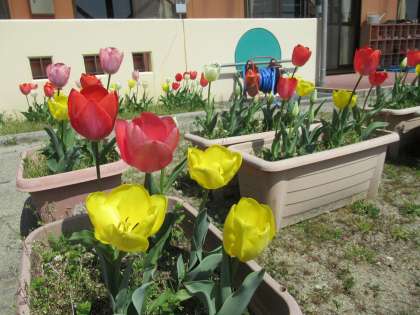 今年度は大変お世話になりました。明日からは4月です。いよいよ新年度が始まりますね。幼稚園にも春が訪れ、きれいなチューリップが咲きましたよ。そして新しく「幼保連携型認定こども園大久保認定こども園」の文字も設置されました。