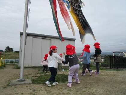 年長組が先日掲揚したこいのぼりがとても気になるようで、外に出るなり一直線でこいのぼりまで走っていく子も。こいのぼりにタッチしたくて、「せーの!」と、ジャンプしていました。