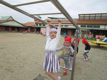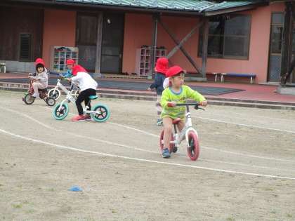 なかよし広場では、うんていや六角ジム、滑り台等の固定遊具、ストライダーや三輪車、キックボードが大人気です。広場は他のクラスの友達との出会いの場です。自分のクラス以外の友達と交流できる機会を今後も大切にしていきたいと思います。