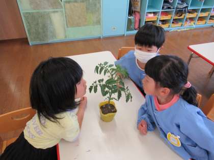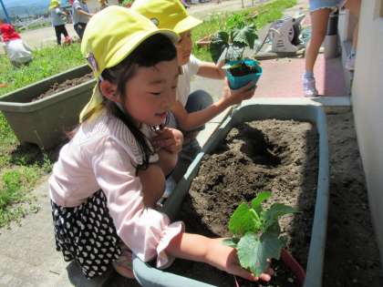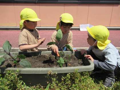 今日は野菜の苗植えをしました。4月下旬から、どんな野菜があるのか、夏に収穫できる野菜はどれかを各クラスで調べたり話し合ったりしながら、自分の植えたい野菜を決めました。今日は植える前に、苗を見たり触ったり匂いを嗅いだりし、それぞれの苗の違いを観察し、その後に植えたい野菜ごとに集まり、役割分担をしながら野菜の苗を植えたり水をあげたりしました。おいしい野菜がたくさん実るように、これから毎日お世話してきたいと思います。
